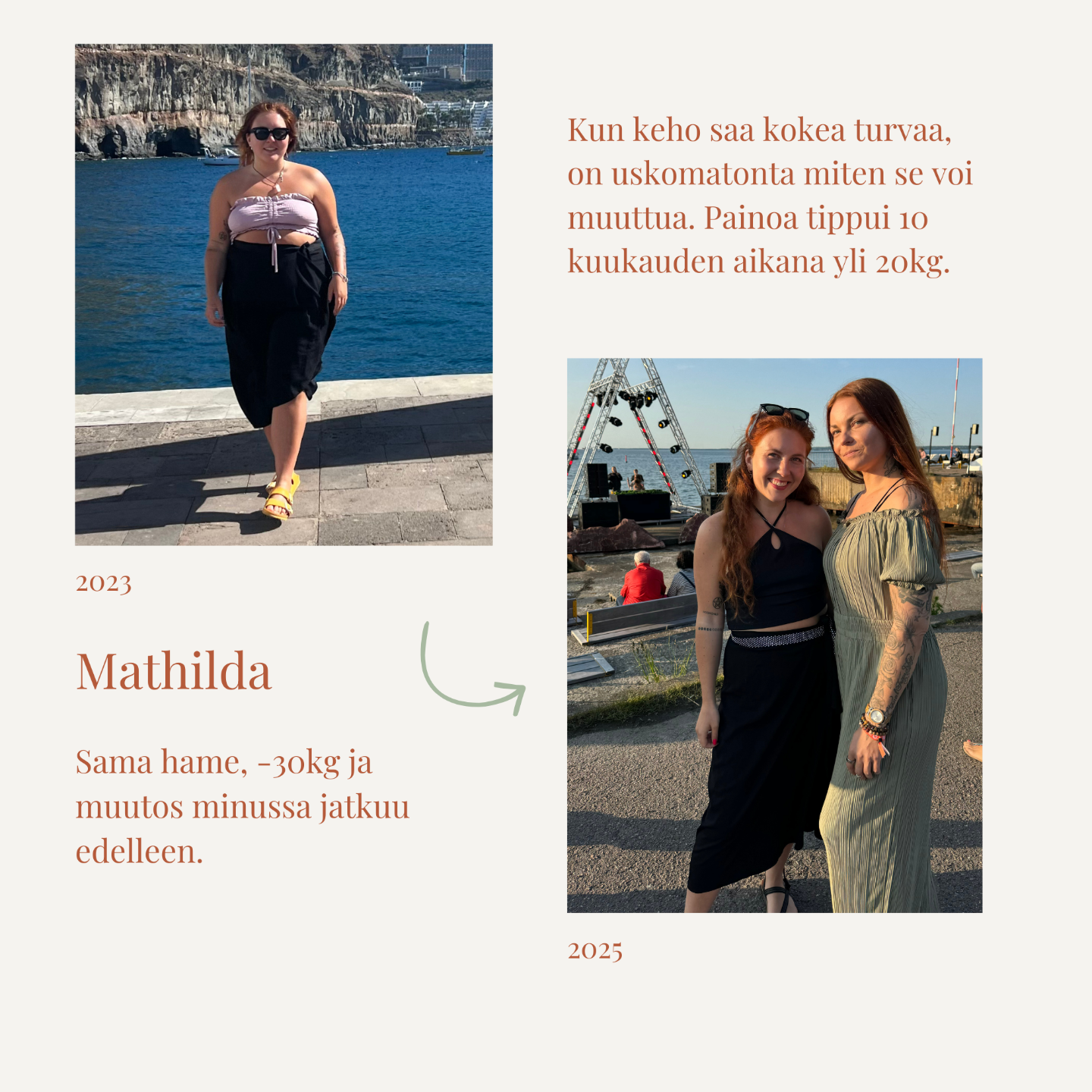Me olemme Mathilda ja Irene. Tämä konsepti syntyi omasta matkastamme ja siitä, mitä olemme nähneet asiakkaissa toistuvasti: pelkkä “tieto” ei muuta mitään, jos keho on ylikuormittunut ja hermosto käy hälytystilassa.
